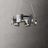 The Chandelier features a circular arrangement of glass spheres, each suspended from elegant iron arms. The smooth, rounded glass creates a symmetrical, airy design, while the iron arms extend outward in a clean, structured form. LED lighting softly illuminates the piece, adding an elegant touch to living rooms, dining areas, or entryways.