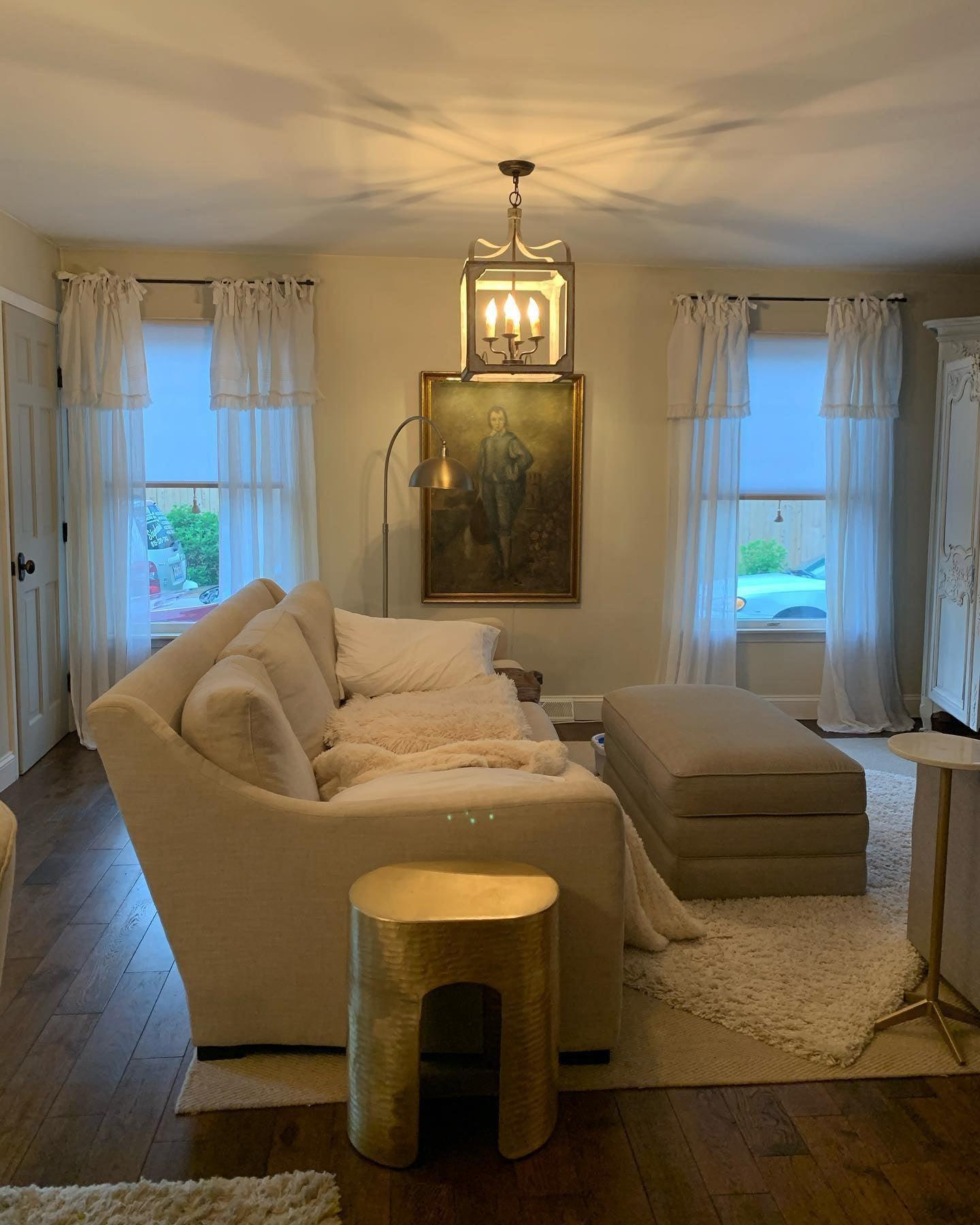 A distressed wood frame in washed grey with golden trim is held aloft by four iron arms. giving this fixture a romantic. weathered cottage-style look and feel. Place this boxy lantern-style chandelier in a foyer or group several above an island or dining table.