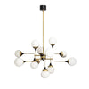 An asymmetrical structure with six brass arms and black enamel details supports twelve white glass globes.