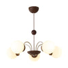 The chandelier features round glass shades on curved arms with wood accents, blending timeless charm and a contemporary twist. Ideal for dining rooms, living spaces, or entryways, it creates a warm focal point with artistic elegance.