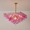 This pendant lamp features layers of faceted fuchsia prism glass in an elegant inverted pyramid shape. The rich color and gold frame create a vibrant, refined ambiance, while the fabric-wrapped cord adds warmth and luxury. Perfect for modern foyers, dining rooms, or stylish lounges, this chandelier makes any space feel expressive and glamorous.