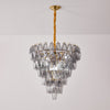 This pendant lamp features layered smoke gray crystal prisms in an inverted pyramid shape, set on a gold frame with a fabric-wrapped suspension. Its dramatic silhouette and muted gray tones offer modern elegance, making it an ideal focal point for grand foyers, staircases, or contemporary dining areas. A statement piece that blends classic luxury with a bold contemporary edge.