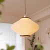 This pendant lamp showcases an elegant oriental-inspired silhouette with a pleated fabric shade, creating a refined texture and timeless aesthetic. The warm, diffused light softly illuminates the room, while wooden accents at the top and bottom add a natural and calming touch. Perfect for dining rooms, living spaces, bedrooms, or boutique interiors, this fabric pendant lamp blends functionality with artistic style, making it a versatile choice for modern homes.