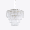 This four-tier chandelier features meticulously arranged fluted glass tubes on a satin brass frame, offering sophisticated illumination and a striking layered effect. Ideal for spacious living rooms or grand foyers, it blends mid-century inspiration with modern elegance. Available in smoked, blush, or clear glass, it elevates any interior with timeless appeal.