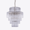 This chandelier features cascading layers of pink prism-shaped glass suspended from a polished frame, showcasing exceptional Murano-inspired artistry. The structured silhouette creates a striking play of light and shadow, making it an elegant centerpiece for dining rooms or grand entryways. Balancing architectural precision and artisanal charm, it adds timeless sophistication to any setting.