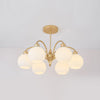 This Lustra Chandelier features eight sculptural white glass globes on elegant gold metal arms, offering a soft and calming glow. A perfect addition to any modern living or dining room with its art deco-inspired charm.